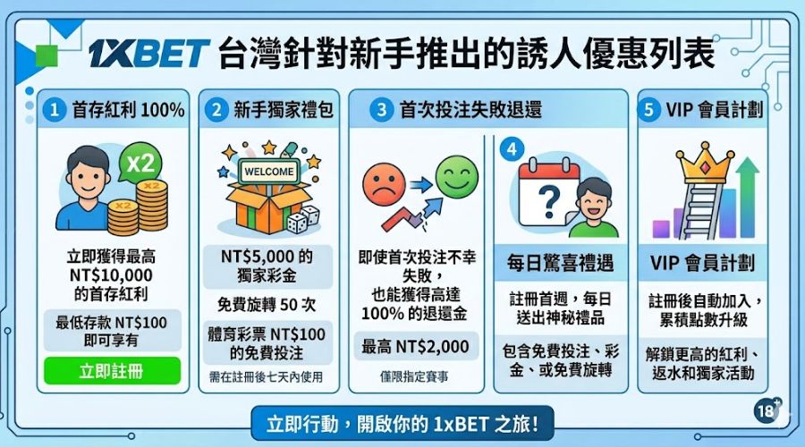 這些豐富的優惠活動旨在大幅提升您的初始資金,讓每一位新會員從起點就能極大化獲勝潛力。立即把握專屬新手獎勵並領取您的首筆紅利,與 1xBET 台灣共同開啟充滿機會的頂級博弈旅程。
